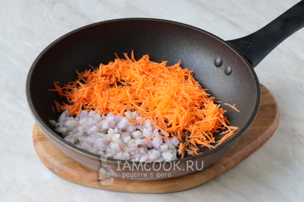 Лук нарежьте кубиками, морковь натрите на тёрке со средними ячейками. Овощную нарезку выложите в сковороду с растительным маслом и жарьте, периодически помешивая, около 3-4 минут.