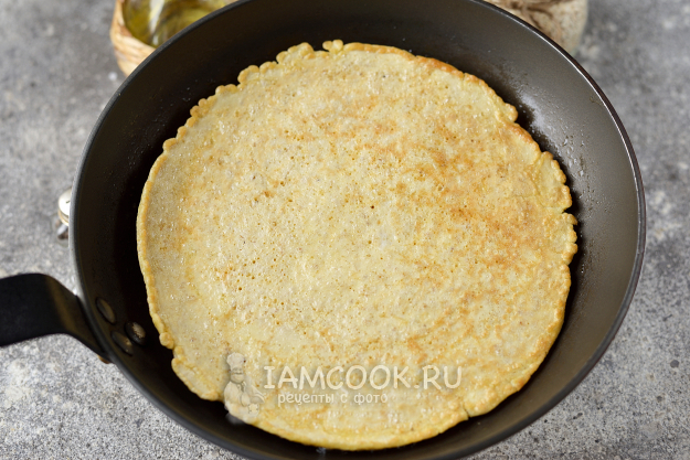 Приподнимите блин лопаткой: если низ зарумянился слегка, его можно перевернуть. Жарьте с обратной стороны еще минуты 2.