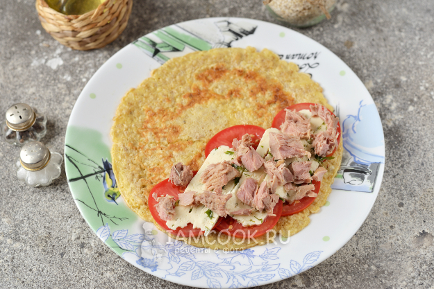 Сверху положите ломтики мягкого сыра и тунца. При желании можно добавить немного натурального йогурта, чтобы сделать блин еще сочнее.