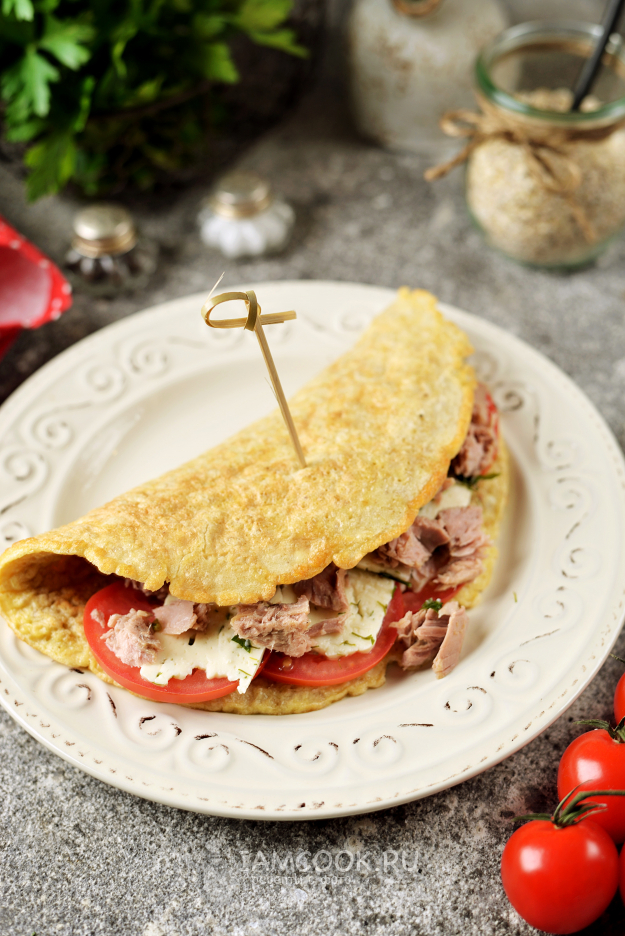 Накройте блин второй половиной, можно скрепить его бамбуковой шпажкой, если не хотите чтобы он сломался пополам. Очень вкусный и полезный овсяноблин с тунцом и сыром готов.