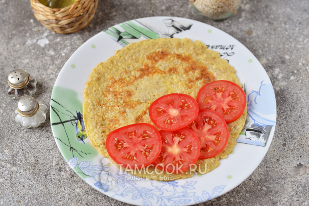 Переложите блин на плоскую тарелку, на одну половину положите нарезанные кружочками помидоры.