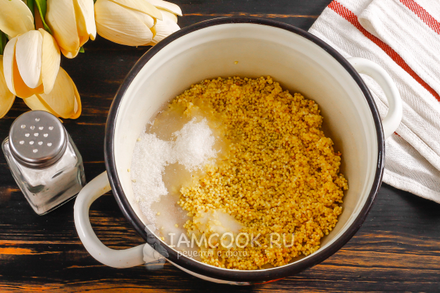 Выложите пшено в кастрюлю, всыпьте соль и сахар. На этом этапе можете добавить ванильный сахар или другие подсластители, ароматизаторы, но не цитрусовые.