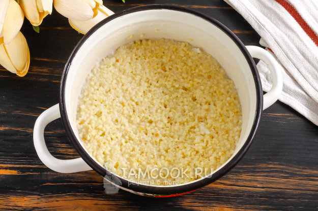 Когда пшено набухнет и начнет развариваться, выключите нагрев и вмешайте в кашу кокосовое масло. Накройте емкость крышкой и оставьте пшенную кашу на кокосовом молоке на 5 минут для пропаривания.