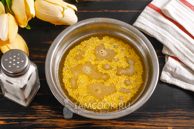 Пшено пересыпьте в глубокую емкость, залейте холодной водой и тщательно промойте. Повторите эту процедуру несколько раз, вымывая из пшена крахмал. Затем воду слейте.