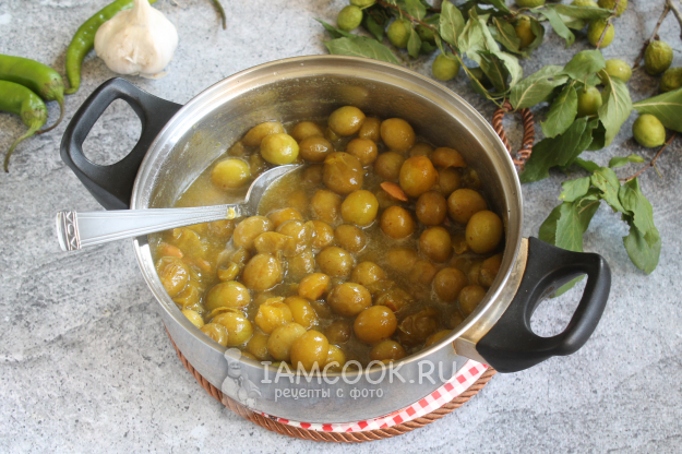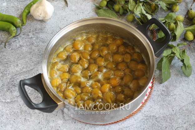 Прогревайте под крышкой и иногда перемешивайте. Алыча быстро «созревает», то есть меняет цвет на желтый, лопается и пускает сок.