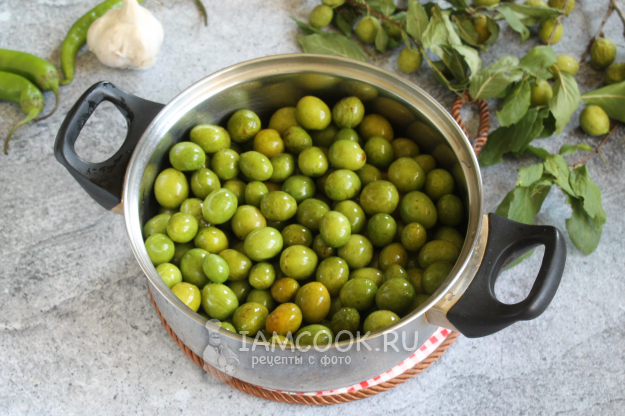 Переложите зеленую алычу в толстодонную кастрюлю-казан, поставьте на тихий огонь. Вода не нужна.