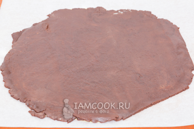 По истечении времени выньте тесто и оба кусочка раскатайте между двумя листами пергамента (сначала белое, затем темное).