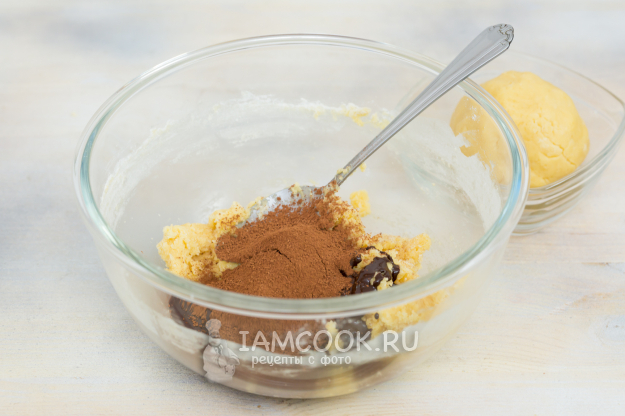 В одну часть добавьте растопленный шоколад и какао.