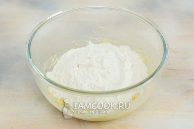 Добавьте муку, смешанную с разрыхлителем.