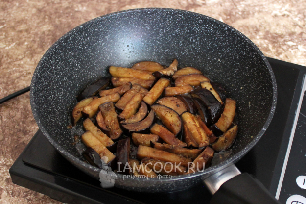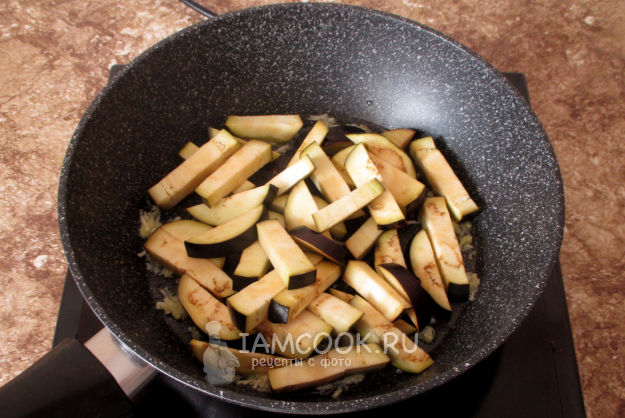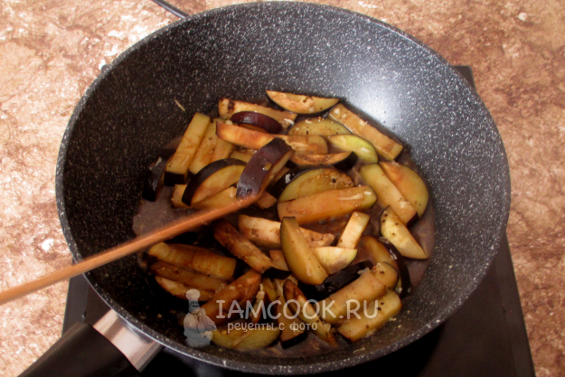Добавьте кусочки баклажанов, прибавьте огонь и жарьте около пяти минут, аккуратно переворачивая. При необходимости подлейте ещё растительного масла.