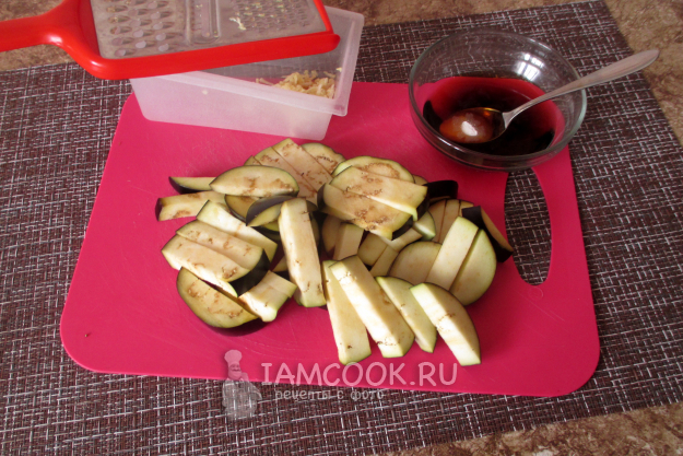 Баклажаны нарежьте брусочками или половинками кружочков. Если сорт горчащий, то советуется посыпать кусочки солью и оставить на полчаса, затем капли сока и соль стряхнуть и при необходимости обсушить.
