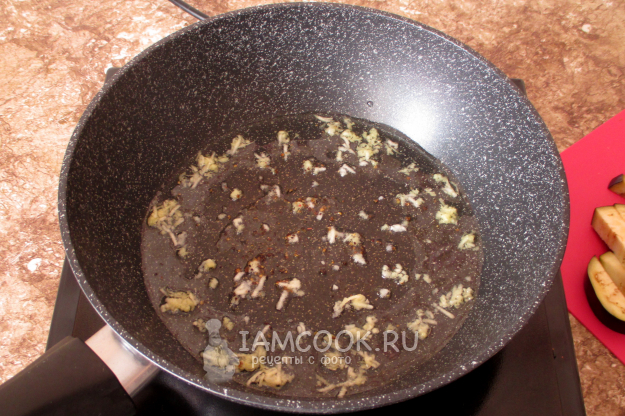 На сковороду налейте растительное масло, на среднем огне нагрейте его в течение одной минуты вместе с подготовленными чесноком, имбирем и молотыми острыми перцами. Если есть свежий перец чили, то и его – туда же.
