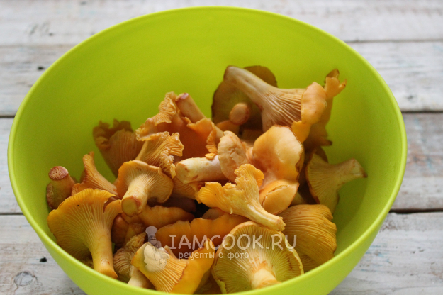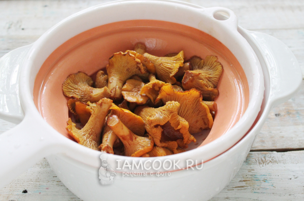 Грибы хорошо переберём, удалим лесной сор. Обычно лисички чистые и это не занимает много времени. Хорошо промоем лисички под краном и прополощем в стоячей воде (в тазике, например, чтобы мелкие частички земли осели на дно).