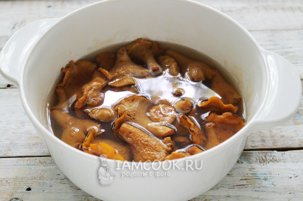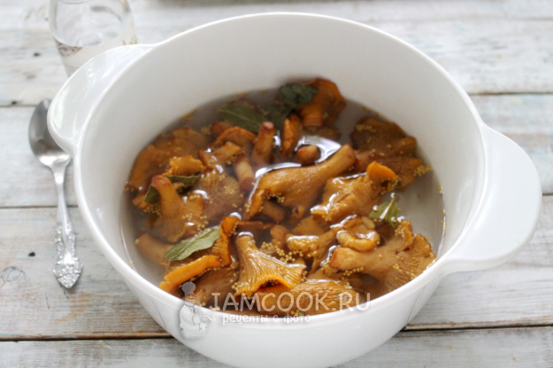 Опустим в кипящий маринад отваренные лисички и проварим минут 10.