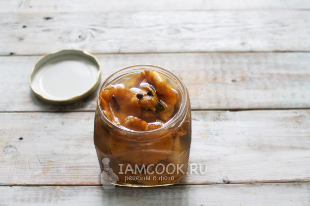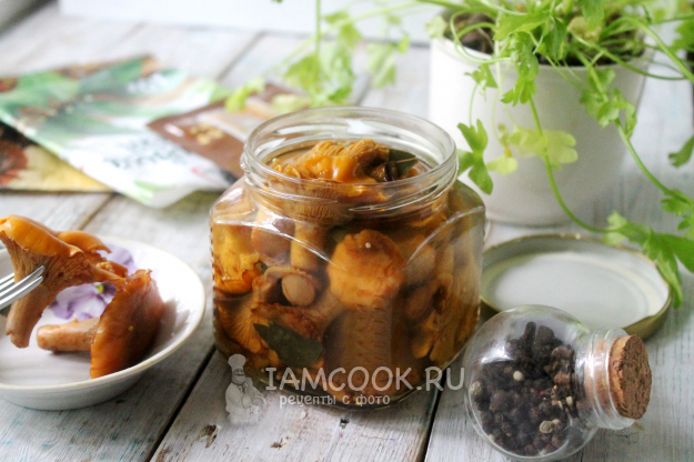 Хрустящие маринованные лисички на зиму готовы. Храним грибы в холодильнике или погребе.