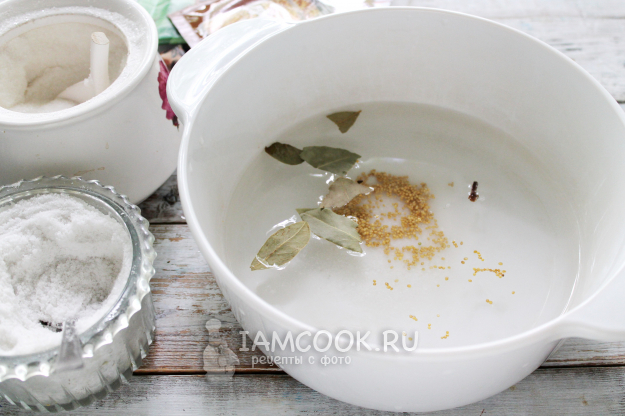 Приготовим маринад, для этого вскипятим воду и бросим все пряности, обозначенные в списке, снова вскипятим и в конце вольем уксус, отставив кастрюлю на край плиты.