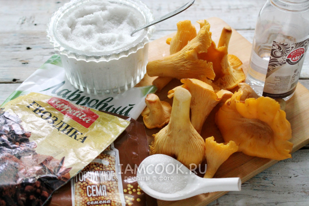 Возьмем продукты для приготовления хрустящих маринованных лисичек на зиму и приступим к заготовке.