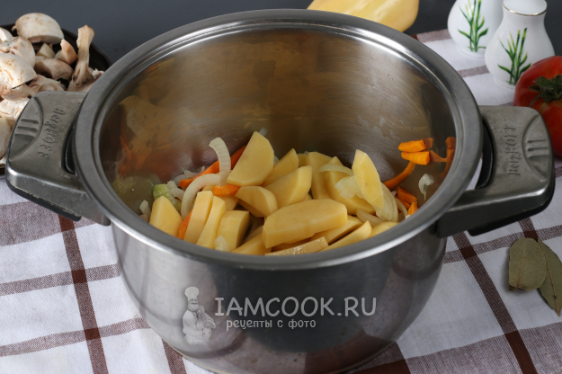В кастрюле разогреть растительное масло, обжарить лук с морковью до мягкости, затем добавить картофель и убавить огонь.