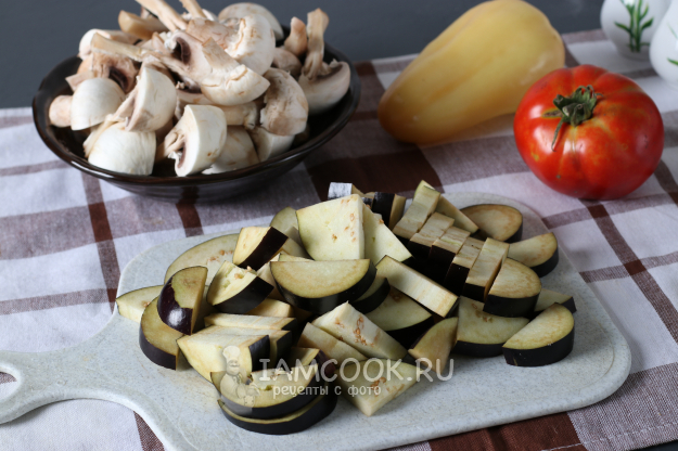Шампиньоны промыть от песка и загрязнений, крупно нарезать на 2-4 части, в зависимости от размера грибов. У баклажанов удалить хвостики, и нарезать баклажаны полукружиями или крупной соломкой. Почистить и нарезать ломтиками картофель.