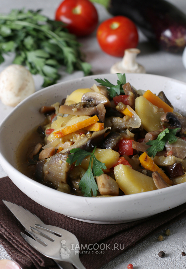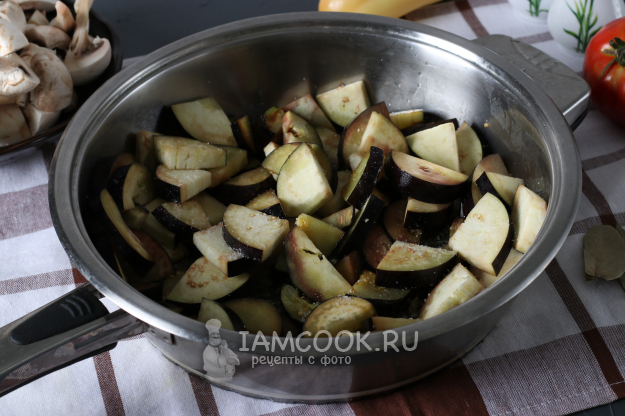 Для приготовления овощного рагу с грибами и баклажанами подготовить из списка необходимые ингредиенты.