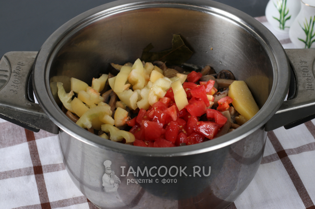 Соломкой нарезать сладкий перец, удалив из него семена. С помидоров снять шкурку и нарезать их кубиками. Если шкурка снимается плохо, это обычно зависит от сорта помидоров, то их предварительно нужно бланшировать. Добавить перец и помидоры в кастрюлю, когда готов картофель, перемешать и готовить ещё 5 минут. Мне нравится, когда перец немного хрустящий, но если вы любите совсем мягкий, то добавляйте его вместе с грибами.