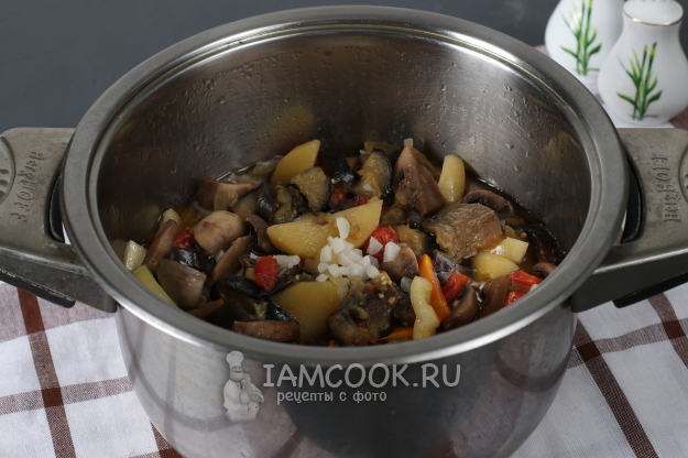 Через 5 минут добавить в кастрюлю измельчённый чеснок, перемешать и выключить огонь. Дать рагу настояться под крышкой 10 минут.