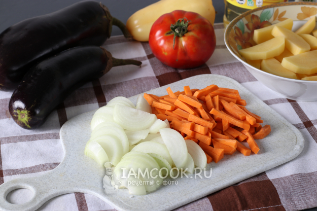 Почистить лук с морковью и нарезать соломкой или другим удобным для вас способом. Мелко нарезать я не советую, лучше когда в рагу хорошо чувствуются все ингредиенты.