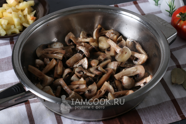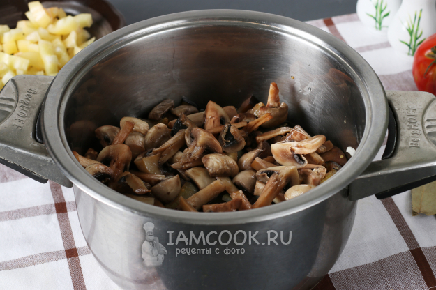 В сковороду добавить грибы и выпарить жидкость, затем посолить и немного обжарить.