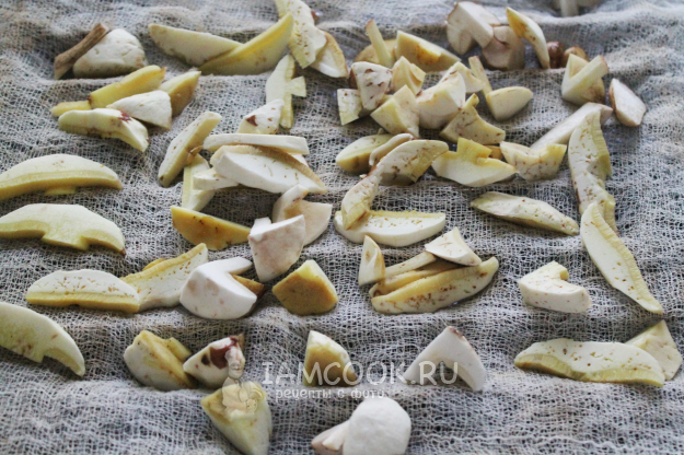 На широкий противень кладем сложенную вдвое марлю - она будет впитывать грибной сок снизу и не позволит грибам прилипнуть. Раскладываем дольки на расстоянии друг от друга.