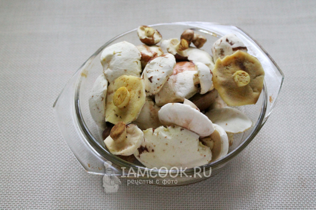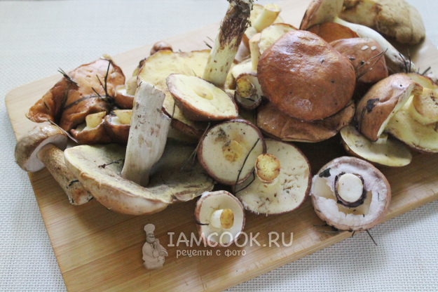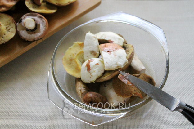 Сухой губкой и ножом очищаем грибы, снимаем верхнюю пленку, обновляем срезы на ножках.