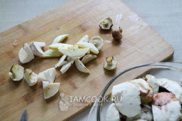 Маслята нарезаем дольками 3-4 мм толщиной, мелкие грибочки оставим целыми.