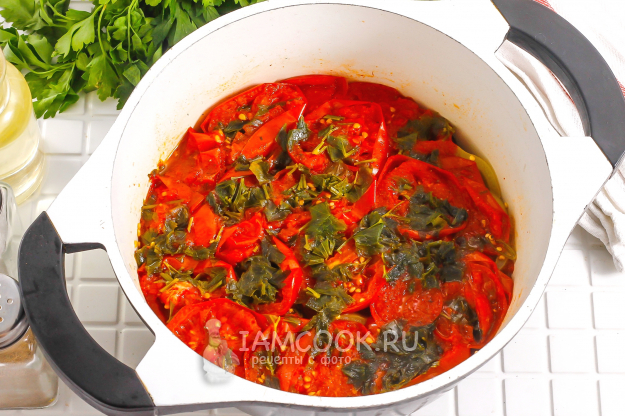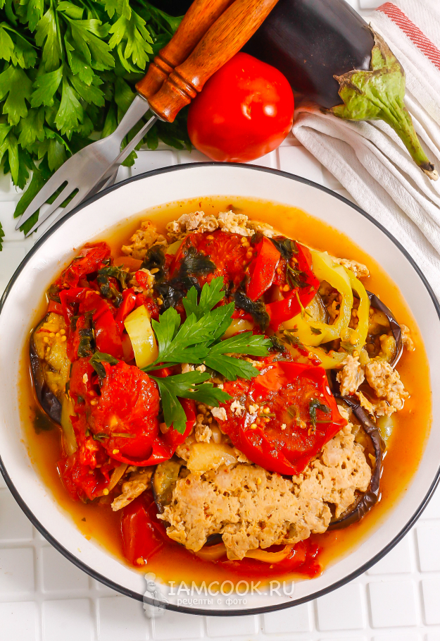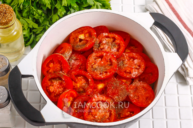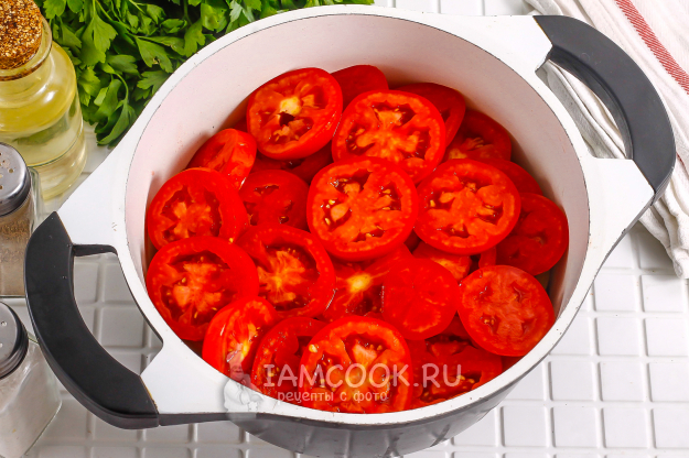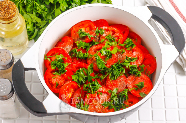 Как только овощи выделят сок и он начнет кипеть, убавьте нагрев до минимального и тушите все еще 35 минут. Не перемешивайте, блюдо должно остаться слоистым.