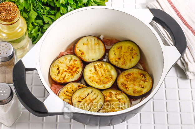 Посолите и поперчите, на слой лука выложите обжаренные баклажаны.