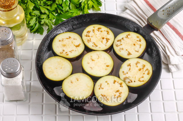 Баклажан промойте в воде, срежьте хвостики с обеих сторон плода. По желанию срежьте и кожицу. Нарежьте кружочками толщиной 0,5 см. Прогрейте на сковороде 1 ст.л. растительного масла и обжарьте баклажанную нарезку по 2 минуты с каждой стороны до румяности.