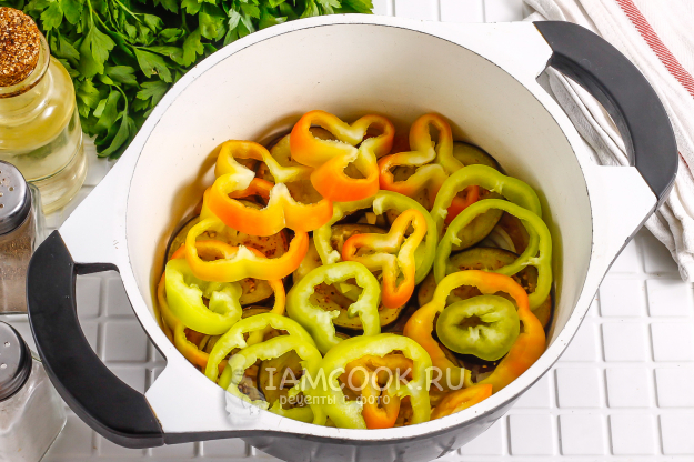 Перец очистите от семян, промойте в воде и нарежьте кружочками, выложите на слой баклажанов.
