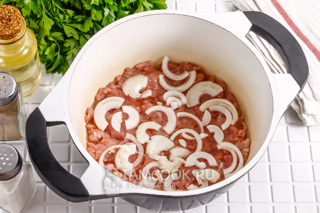 Смажьте дно казана 1 ст.л. растительного масла и выложите мясной фарш. Очистите луковицы от кожуры и промойте в воде. Нарежьте полукольцами и выложите на фарш.
