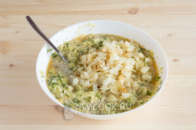 Жареный лук добавьте к овощной массе и снова размешайте.