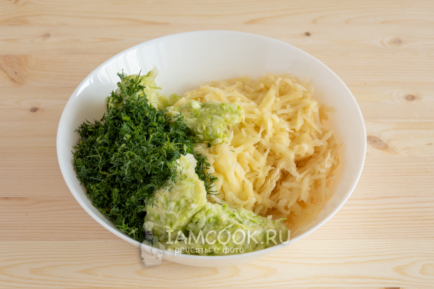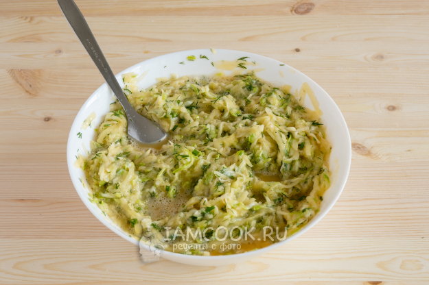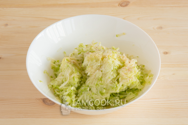 Первым делом натрите на бурачной тёрке кабачок. Если он у вас молодой, то тереть можно и с кожурой. Кабачок посолите, перемешайте и дайте постоять несколько минут, чтобы он пустил сок.