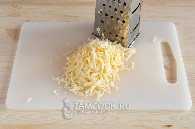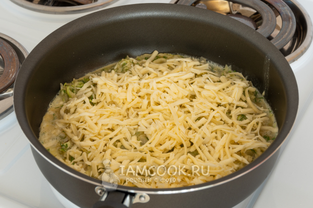 На разогретую сковороду с растительным маслом выложите половину овощной смеси и разровняйте равномерно по дну сковороды. Сверху посыпьте тёртым сыром.