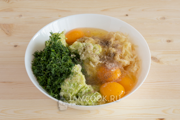 Вбейте туда же яйца. Выдавите через чесночницу чеснок, посолите и поперчите по вкусу. Помните, что кабачок мы уже солили, поэтому будьте аккуратны с солью.