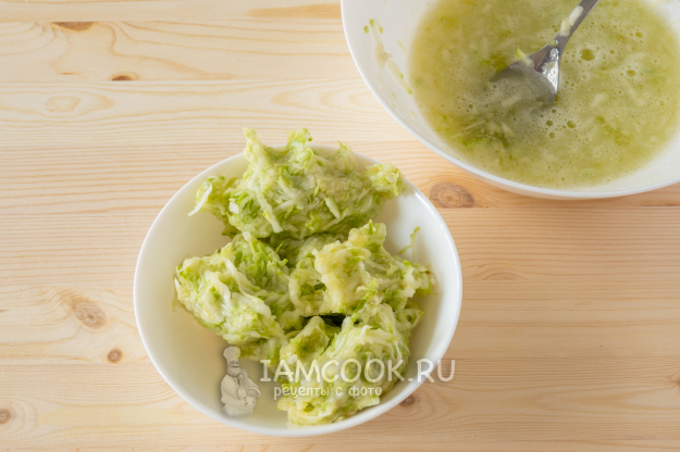 Отожмите кабачок от лишнего сока, который выделился. Можно руками, а можно с помощью сита и ложки.