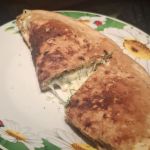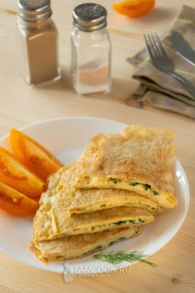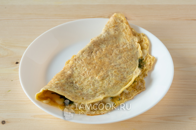 Сложите блин пополам и жарьте ещё несколько секунд, чтобы расплавился сыр. Так же приготовьте и второй блин.