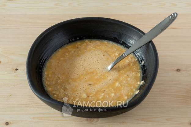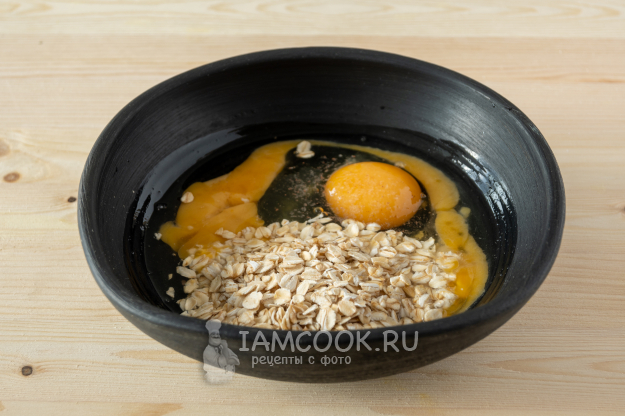 В миску вбейте яйца, влейте воду и всыпьте овсяные хлопья.