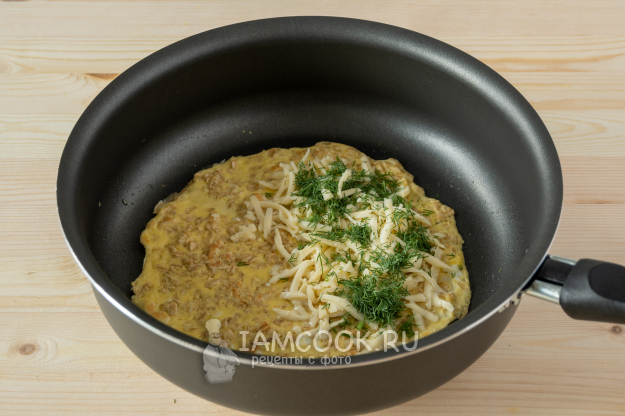 Выложите на половину блина половину тёртого сыра и половину укропа.