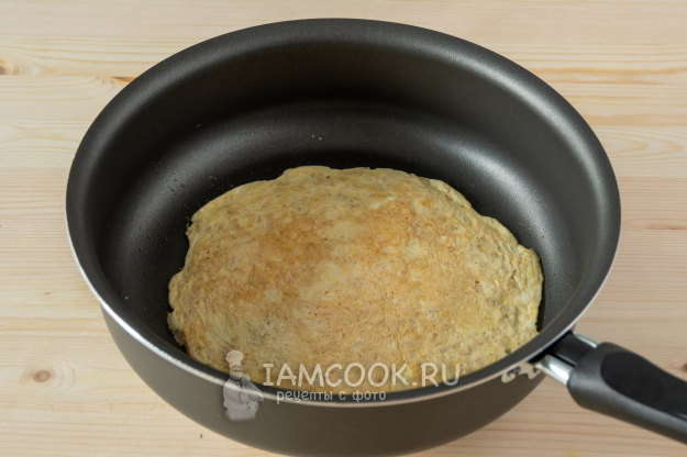 На разогретую сковороду выложите половину яично-овсяной массы и равномерно распределите по сковороде. Жарьте блин на медленном огне минуты 2, а затем переверните блин. Жарьте с другой стороны буквально 1 минуту и снова переверните.