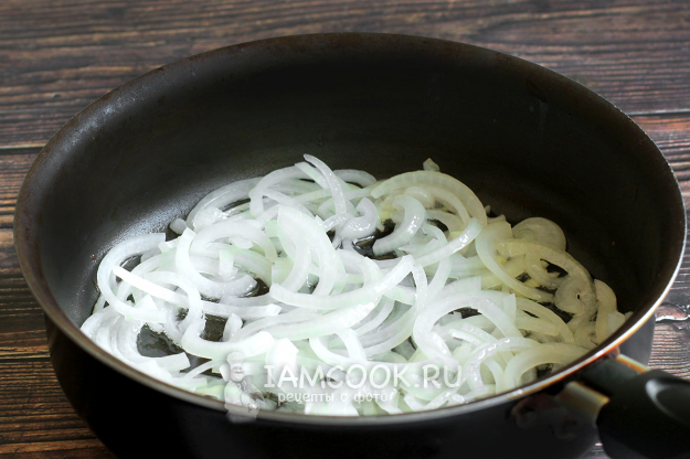 Репчатый лук нарежьте полукольцами и обжарьте в растительном масле 3 минуты.