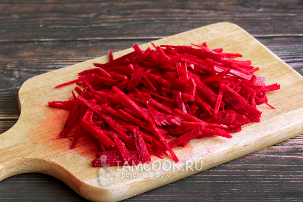 Свеклу нарежьте тонкой соломкой или натрите на корейской терке.