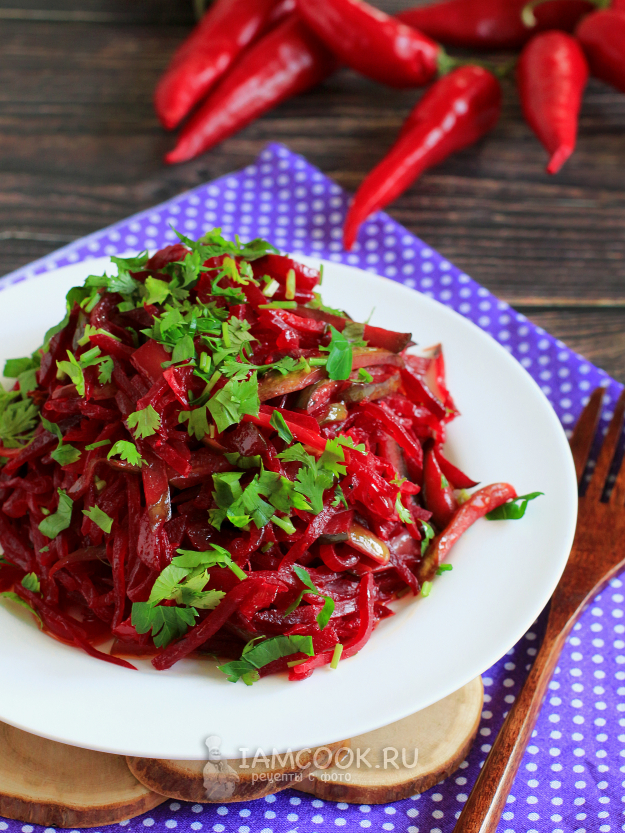 Подавайте салат из жареной свеклы с луком и огурцами, посыпав свежей зеленью. Приятного!