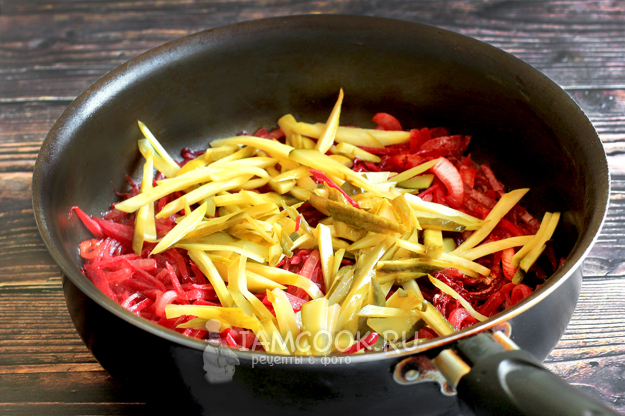 Затем добавьте нарезанные соломкой соленые огурцы и влейте рассол. Закройте крышку и тушите еще около 10 минут.