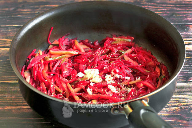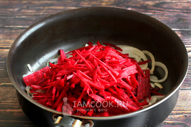 Добавьте к луку сырую свеклу и тушите на малом огне под крышкой до мягкости свеклы, но не до полной готовности.
